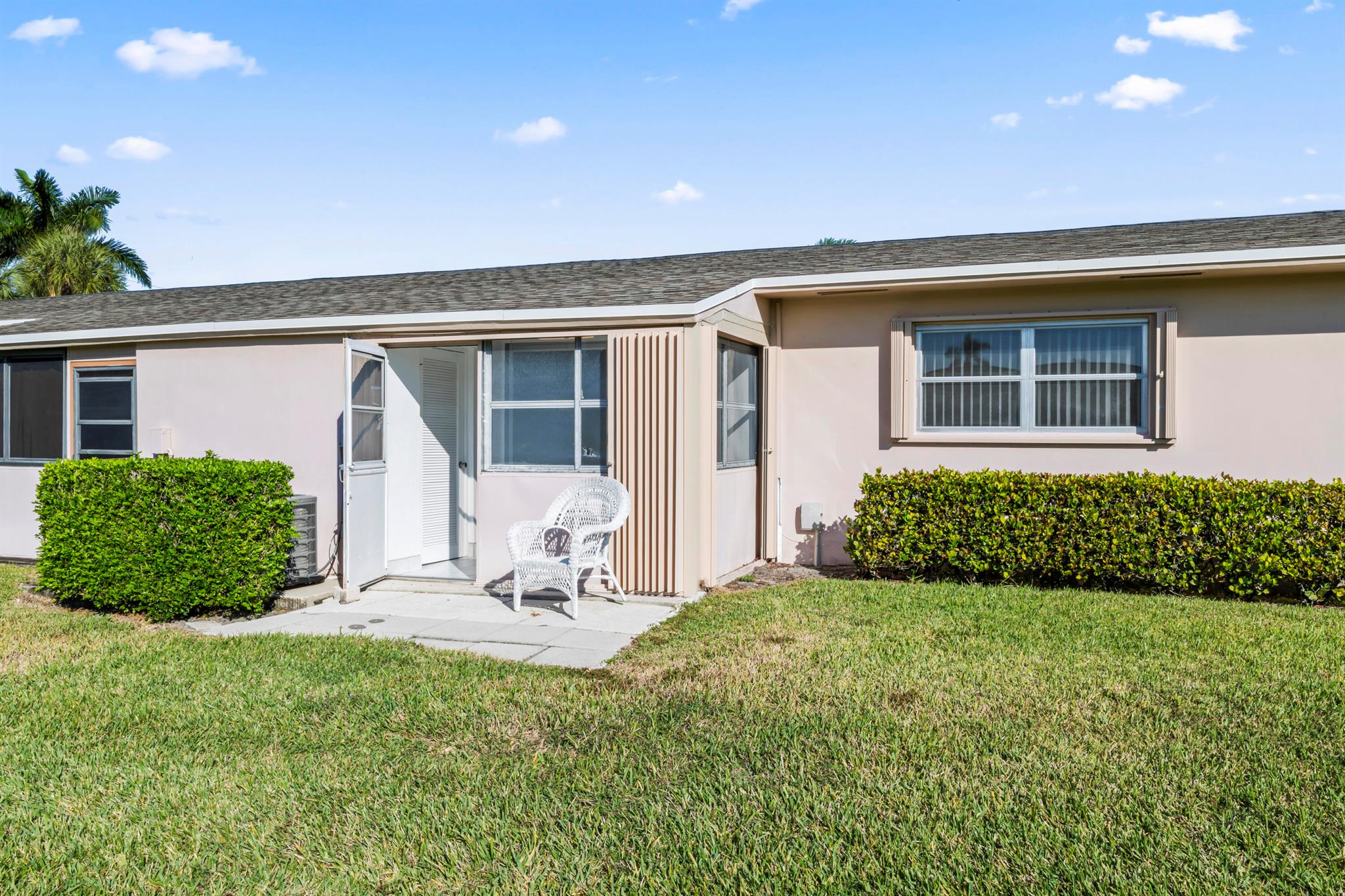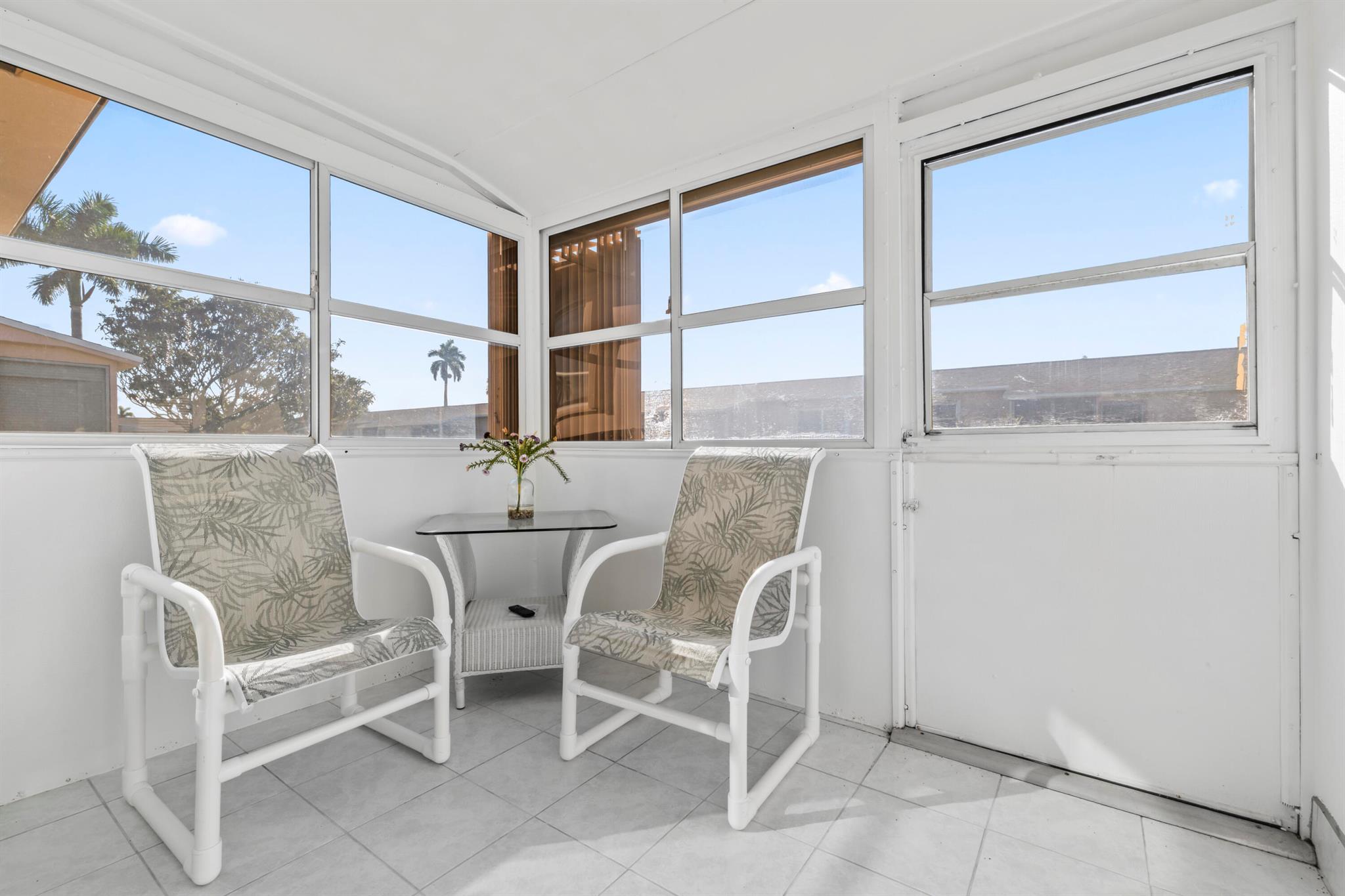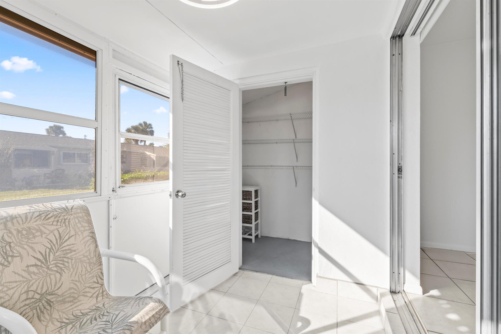 Updated 1 bed, 1 bath villa in the 55+ community of Cresthaven Villas. Features include a new A/C, new countertops, and remote-controlled lighting with ceiling fans. Renovated bathroom with walk-in shower, marble-style tile, glass door, safety bar, new vanity, updated lighting, and chair-height toilet. Tile flooring throughout. Enclosed screened porch with large storage closet. Accordion hurricane shutters on all windows and porch. Common laundry nearby. Parking directly outside the front door. Low $362 monthly maintenance includes cable, water, and internet. Amenities include heated pool, sauna, clubhouse, fitness center, and social rooms. Close to shopping, medical, bus service, and Lake Worth Beach.