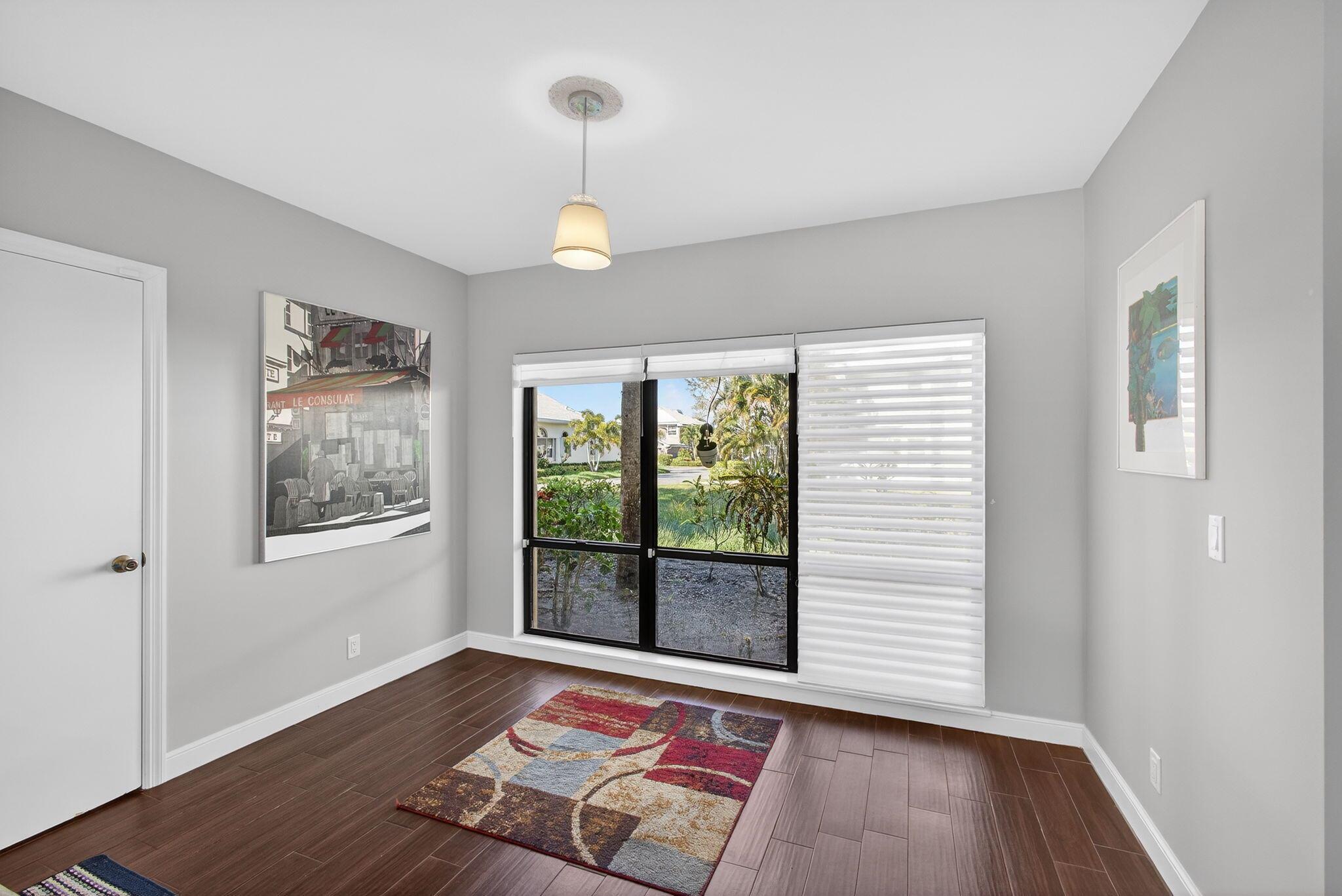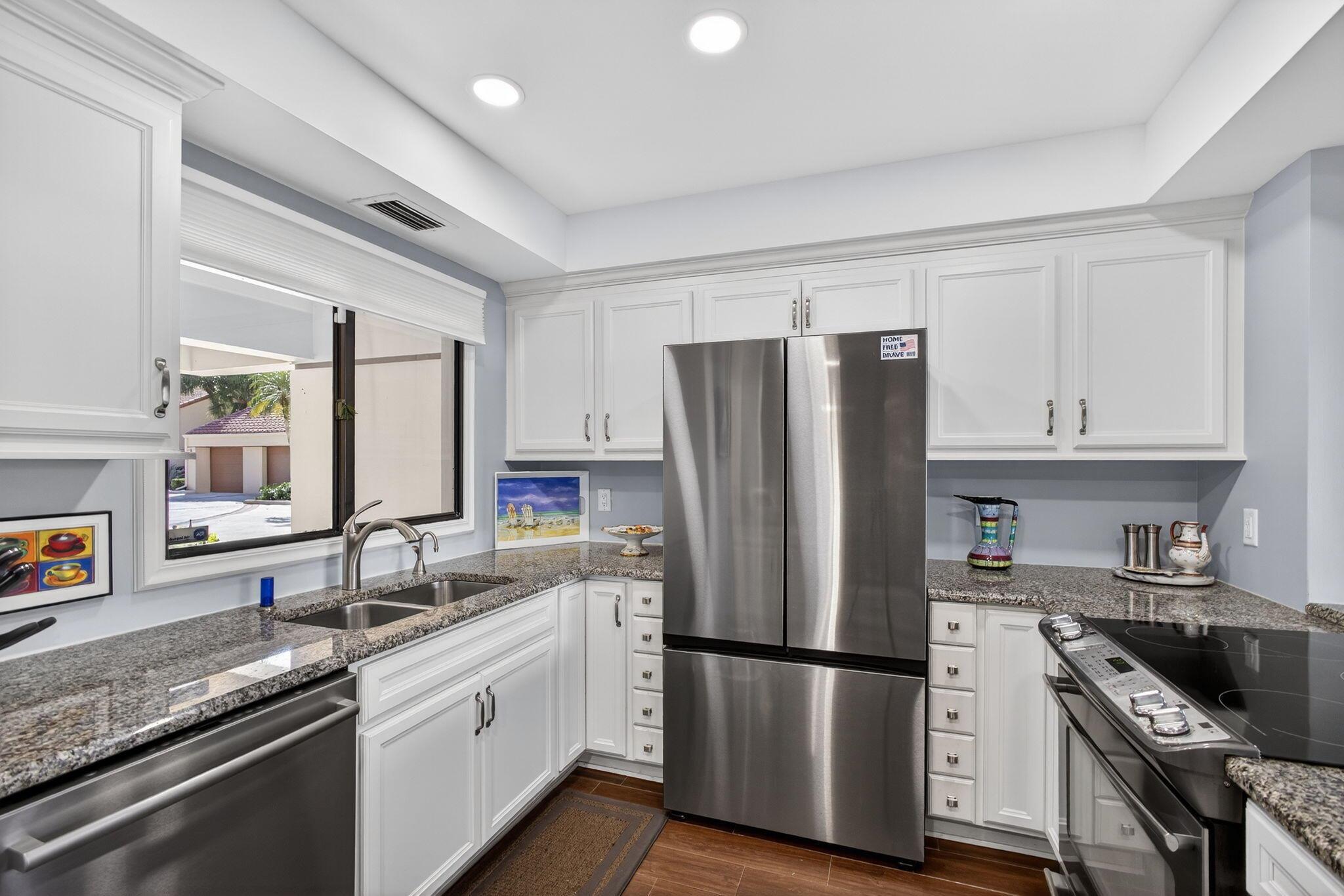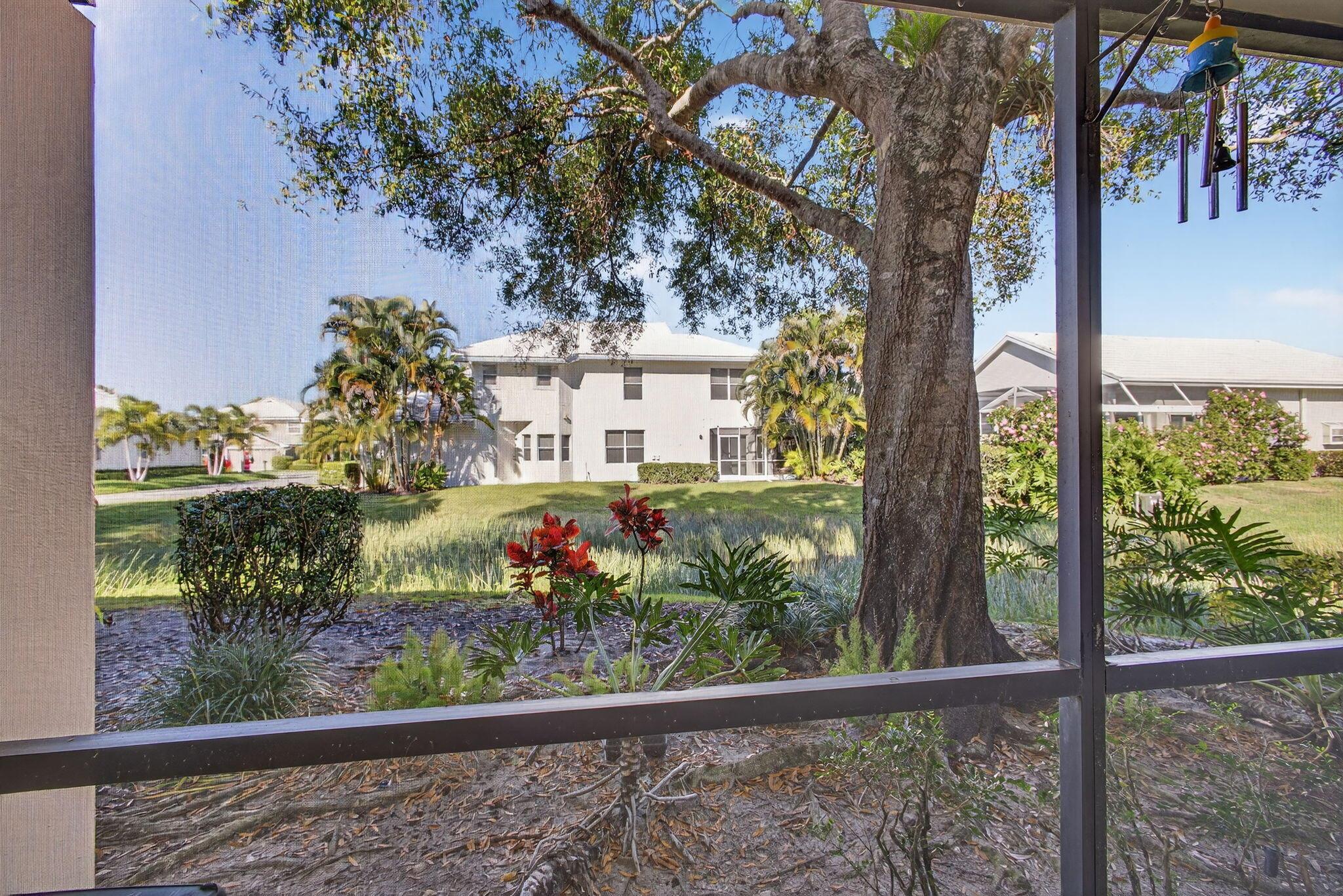 Located in the small 17 unit enclave of The LAKES condo within Canterbury at PGA National. This one story unit is in the absolute best locating in LAKES. Located on the first floor with 1422 SF of living space, 2 bedrooms and two baths plus TWO screen enclosed patios overlooking a pond and water feature. The lay out is OPEN and sunny with loads of natural sunlight. The kitchen and baths have been beautifully updated. Flooring throughout is ceramic tile that looks like natural wood. The kitchen has white cabinetry and granite counter tops. All of the cabinets have pull out drawers. The entire house is a neutral pallet leaving a blank canvas to decorate to your own liking. NEW ROOF 2025, EXTERIOR PAINTED 2025, NEW A/C, NEW W/D, NEW BREAKER PANEL, NEW T-STAT, REFRIG ++ Must see!!!
