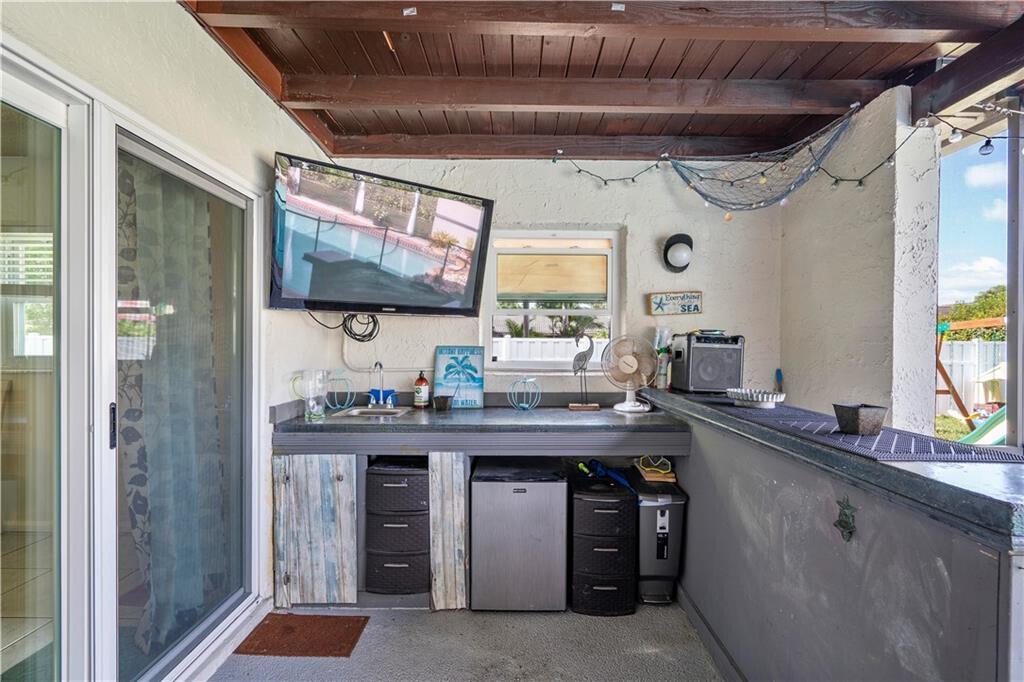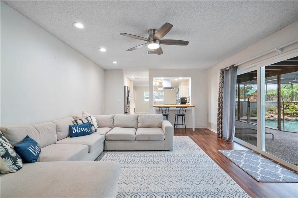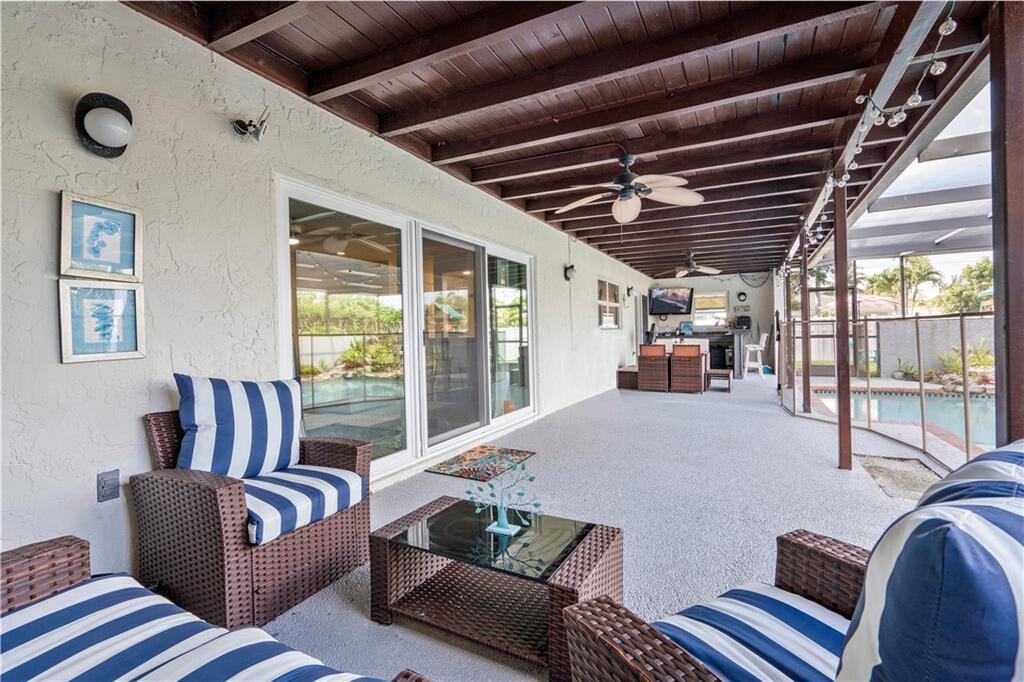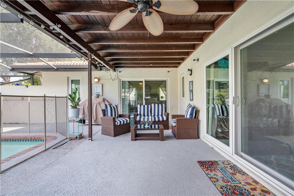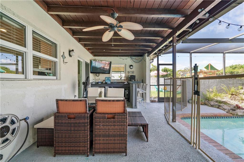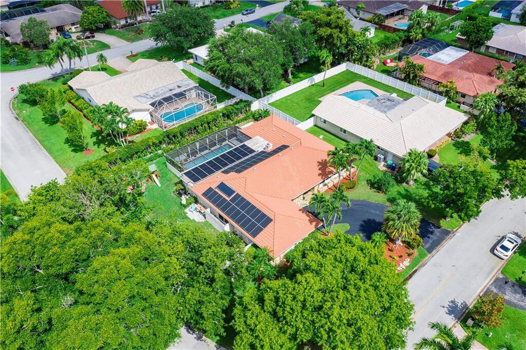 UPGRADES GALORE! Stunning 4-Bedroom possible 5th Bed/Den or Bonus room, 2.5-Bath home beautifully landscaped corner lot fenced with fruit trees, screened patio with heated salt chlorinated pool, Built-in Wet Bar, 10 Kilowatt Solar Panel System, 80 Gallon solar water heater, Huge yard, Hurricane impact windows, doors AND garage door to provide peace of mind during hurricane season, Outlet for electric car, generator hookup, new fence, protective gutter covers. Gorgeous updated kitchen with Stainless Steel appliances including newer Samsung smart refrigerator. Updated bathrooms. Spacious living and dining rooms PLUS a wonderful BONUS room that can be used as an office/playroom. You will fall in LOVE with this home.