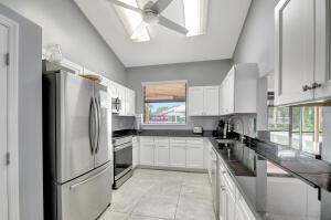 Experience comfortable living in this beautifully maintained 2/2 condo w/split floor plan, vaulted ceilings & serene lake view from screened balcony. Spacious primary suite offers a nook, 2 closets (including a walk-in), & en-suite bathroom w/skylight & walk-in shower. Kitchen equipped w/pantry, breakfast nook, SS appliances, granite countertops, backsplash & refaced cabinetry. 2nd bedroom with balcony. 2nd bathroom w/ skylight & bathtub. Other features: *Full-size washer & dryer *2024 A/C *4+ yr old water heater w/new electrical outlet *Accordion & roll-down shutters * 2023 Roof *Assigned parking in front of bldg. *1 pet under 25 lbs. allowed. Condo fees cover basic cable, water, sewer, trash, roof & exterior maintenance, bldg. insurance, reserves, & common areas.